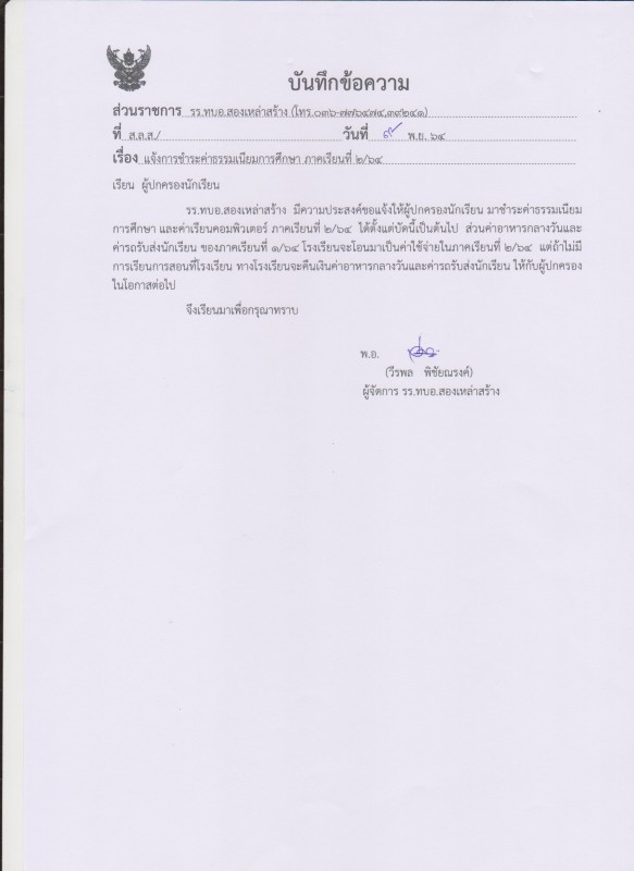 แจ้งการชำระค่าธรรมเนียมการศึกษา ภาคเรียนที่ 2/64